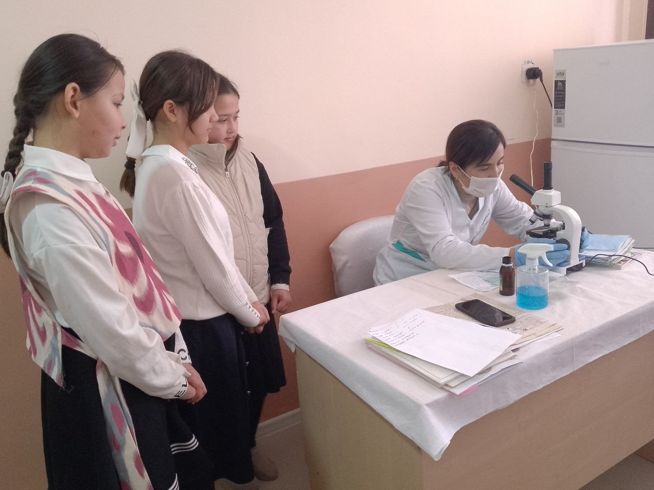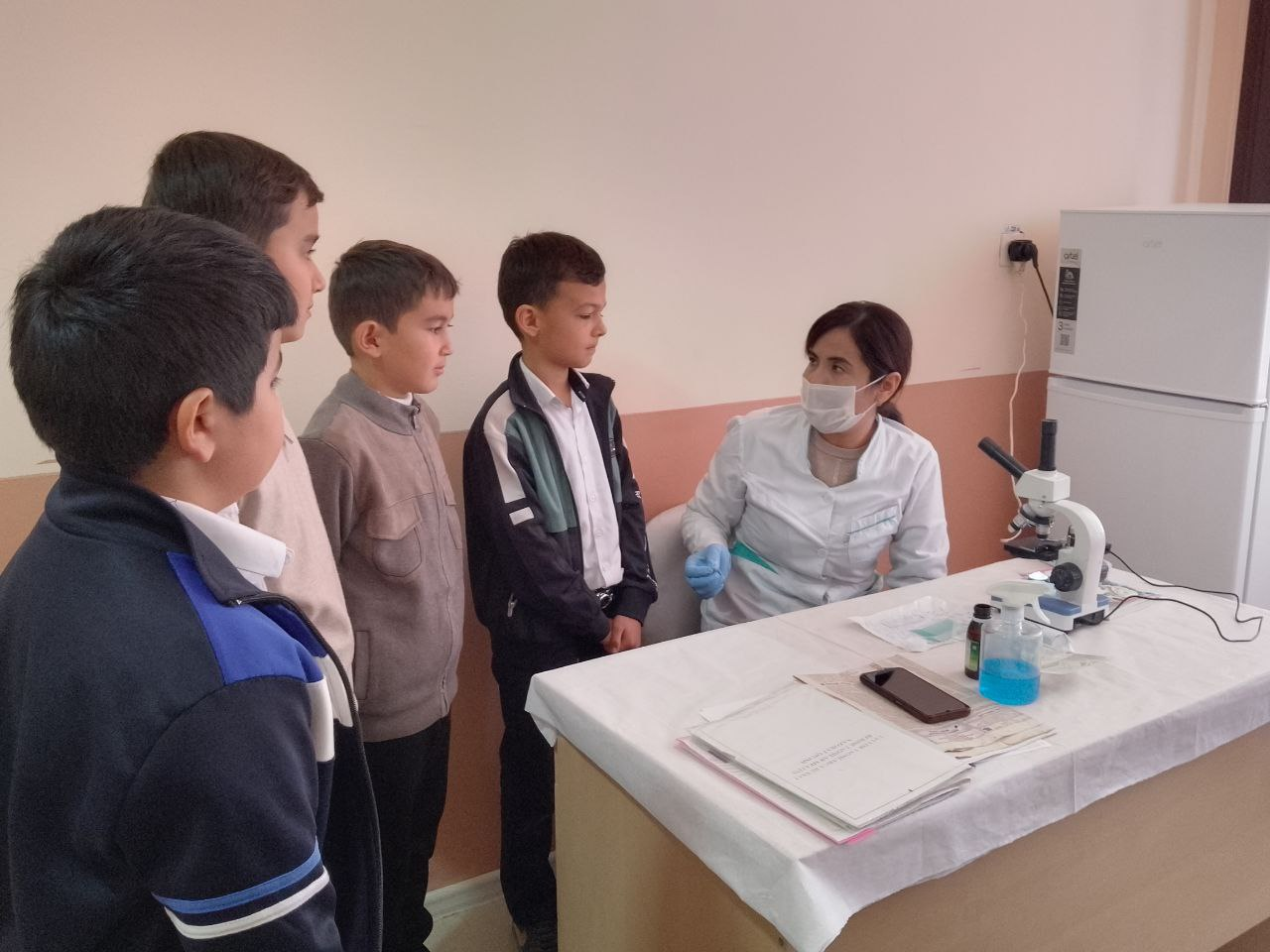 Mazkur tadbir davomida barcha sinf o‘quvchilari soskov usulida laborator tekshiruvdan o‘tkazildi. Namuna mikroskop yordamida tahlil qilinib, gijja (gelmint) kasalliklarini erta aniqlash imkoniyati yaratildi.