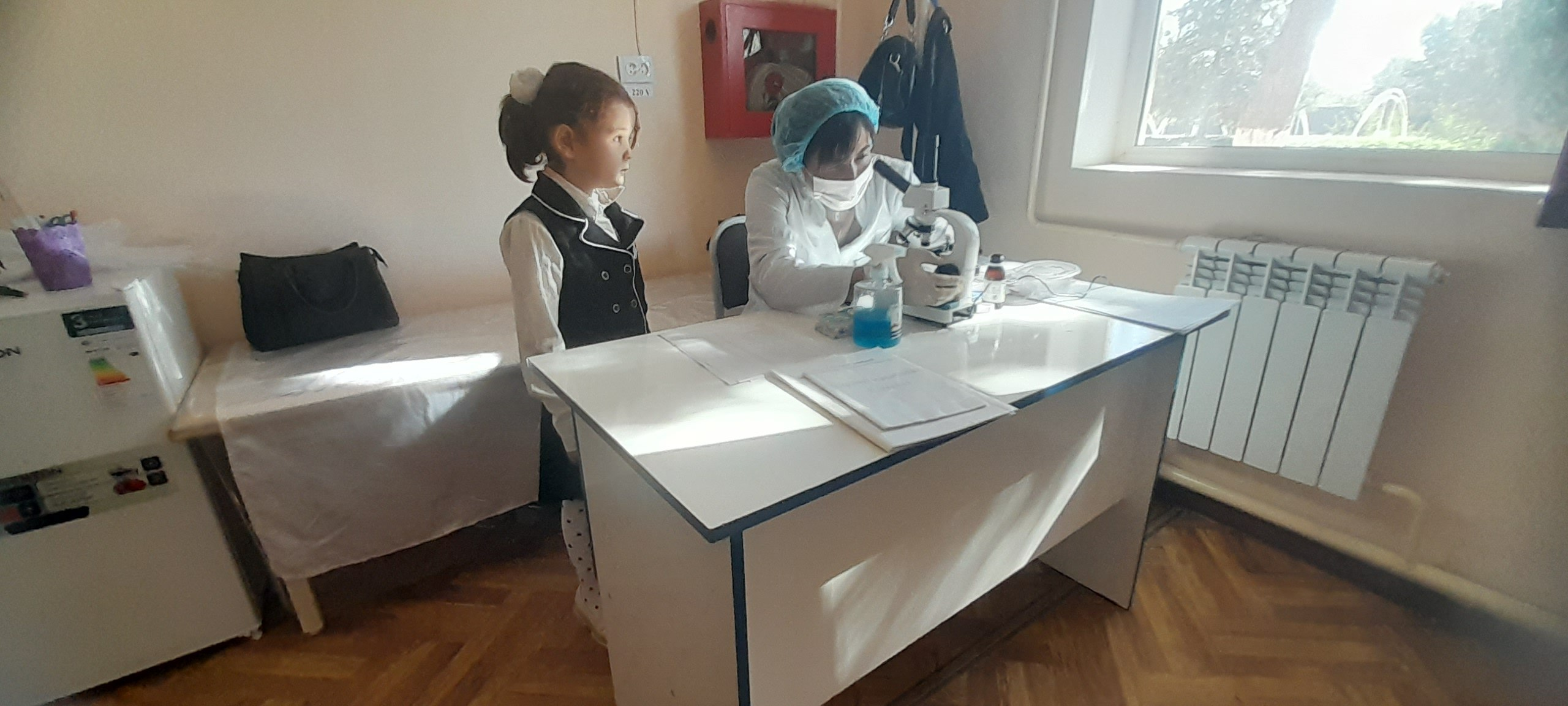 Mazkur tadbir davomida barcha sinf o‘quvchilari soskov usulida laborator tekshiruvdan o‘tkazildi. Namuna mikroskop yordamida tahlil qilinib, gijja (gelmint) kasalliklarini erta aniqlash imkoniyati yaratildi.